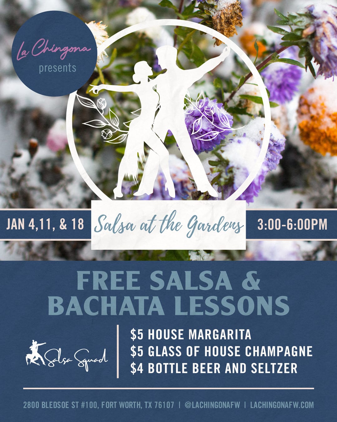 Join us for Salsa Sunday at La Chingona in Fort Worth and enjoy an afternoon of Latin dancing! The event will take place from 3 PM to 6 PM and feature salsa and bachata rhythms. Whether you’re a seasoned dancer or just starting out, this event is perfect for anyone looking to have a great time. You don’t need to bring a partner to join the fun. Dance lessons begin at 3 PM. You will be among some of the most talented individuals in the dance community, ensuring an amazing experience. This is a FREE EVENT, giving you the chance to meet new people and enjoy yourself. See you there! Free parking at the Farrington Field parking lot (1.5 blocks south of La Chingona).